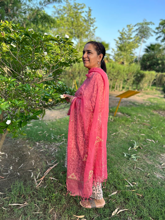 Pink Kota Doria Chikankari Dupatta