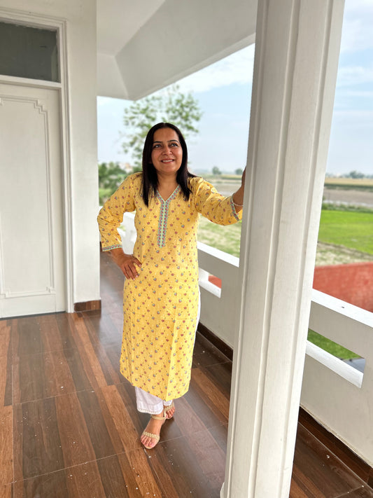 Yellow Block Printed Kurta